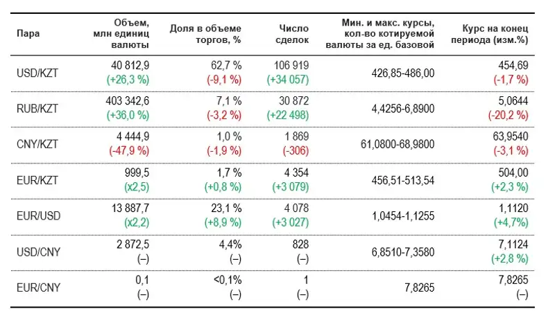 "В 2023 году доля торгов валютной парой доллар США-казахстанский тенге в общем объёме торгов иностранной валютой снизилась до 62,7%, в 2022 году доля торгов данной валютной парой составляла 75,7%. При этом возросла доля торгов валютной парой евро-доллар США и по итогам года составила 23,1%". KASE