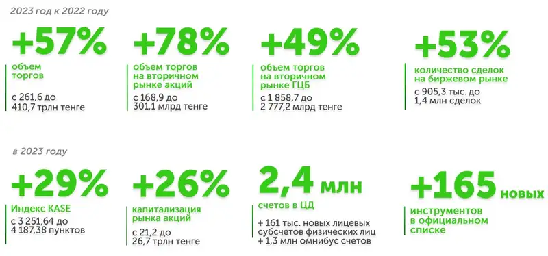 Объём торгов акциями в 2023 году относительно 2022 года увеличился на 8,5%, или 26,3 млрд тенге, до 333,6 млрд тенге. Капитализация рынка акций с начала года выросла на 26,4%, или 5,6 трлн тенге, и составила 26,7 трлн тенге.