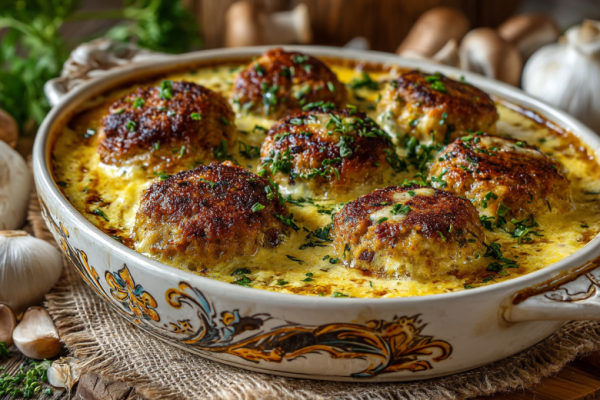 Грибы и лук мелко рублю — можно ножом, можно в блендере, но не в пюре, а чтобы чувствовались кусочки. На сковороде разогреваю немного масла, обжариваю лук до прозрачности, добавляю грибы и жарю, пока не выпарится почти вся жидкость. Снимаю с огня, солю, перчу и всыпаю манную крупу. Тщательно перемешиваю и даю постоять минут 10–15, чтобы манка набухла и впитала грибной сок. Из получившейся массы влажными руками формирую котлетки. Выкладываю их в форму для запекания, смазанную маслом. Готовлю соус: смешиваю сметану с водой, добавляю соль, перец, измельченный чеснок и щепотку мускатного ореха. Заливаю котлеты так, чтобы соус доходил примерно до половины высоты. Отправляю в разогретую до 180 °C духовку на 30–35 минут, пока соус не загустеет и не покроется лёгкой золотистой корочкой. Подаю горячими, щедро полив соусом из формы.