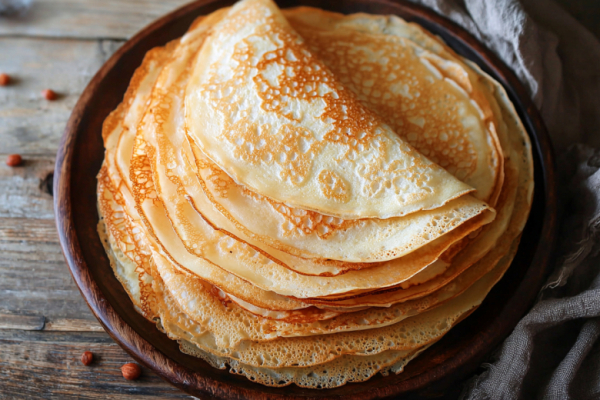 Рецепт: в глубокой миске взбейте яйца с сахаром и солью до лёгкой пены. Добавьте стакан молока и снова взбейте. Постепенно всыпьте весь стакан просеянной муки и тщательно размешайте венчиком до однородности без единого комочка — тесто будет густым. Теперь, продолжая помешивать, тонкой струйкой влейте стакан воды. В конце добавьте растительное масло и ещё раз хорошо перемешайте. Тесто должно быть достаточно жидким. Дайте ему отдохнуть 20-30 минут при комнатной температуре — это сделает блины более эластичными. Перед выпеканием хорошо разогрейте сковороду, слегка смажьте её маслом (только для первого блина). Жарьте блины на среднем огне до румяного края с двух сторон.