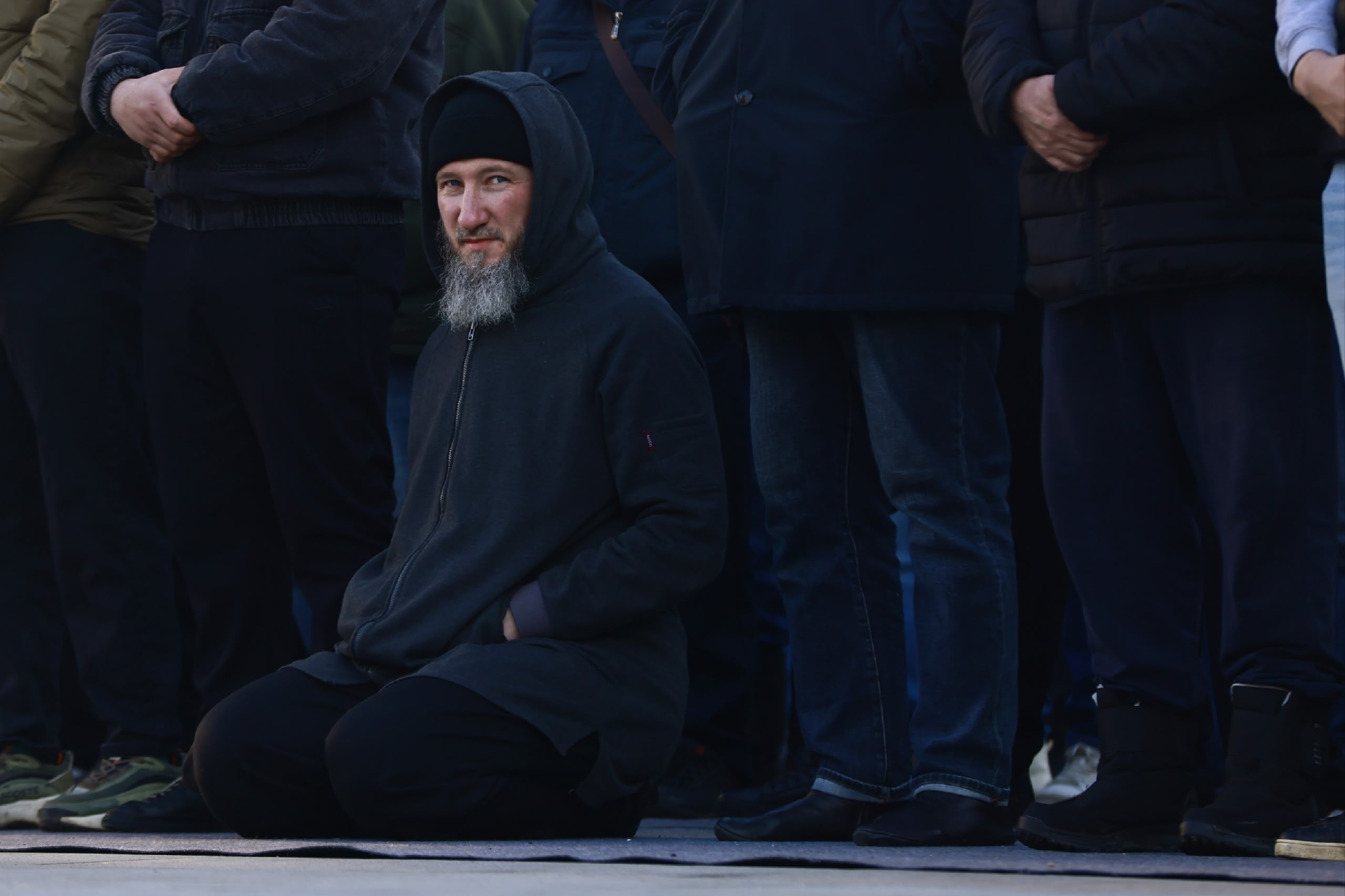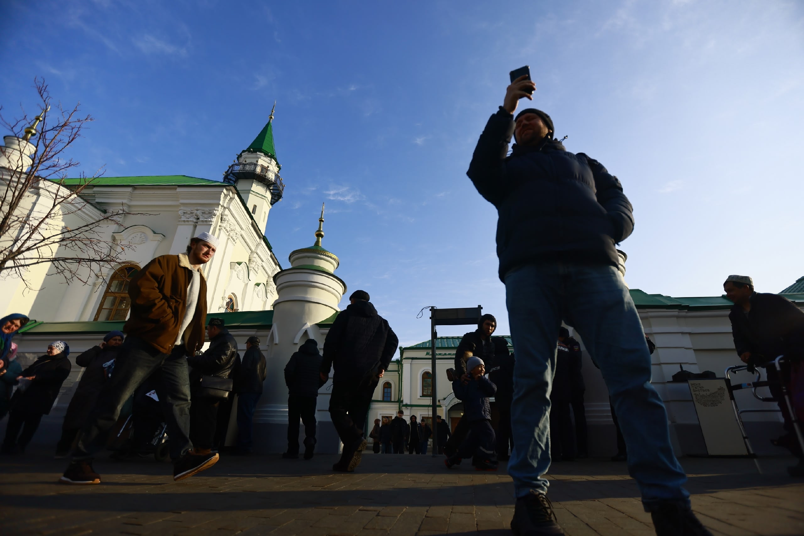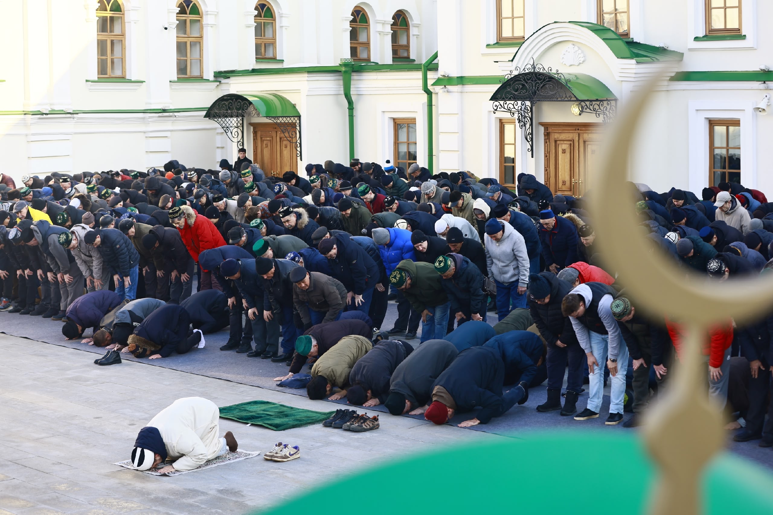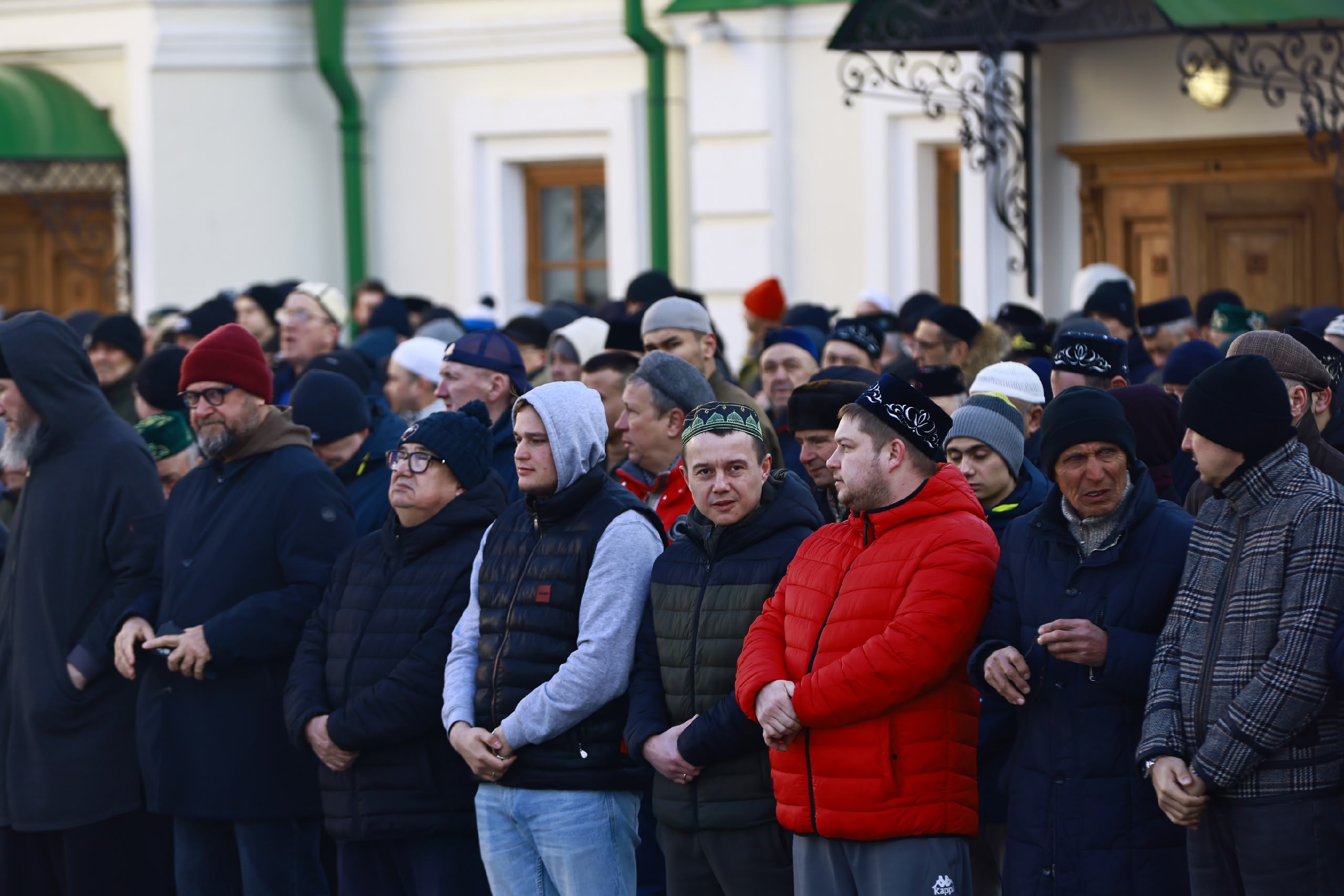 Оставляем мужчин молиться и спускаемся вниз. Тем временем люди все продолжают идти к мечети — в 7:30 состоится гает-намаз, это коллективная праздничная молитва. Для них раскатывают удлиненные коврики, но ткани все равно хватает не всем. К половине восьмого утра у здания стоят сотни мужчин в тюбетейках и шапках. Они улыбаются и переговариваются, поправляют капюшоны себе и сыновьям — утро выдалось холодным.