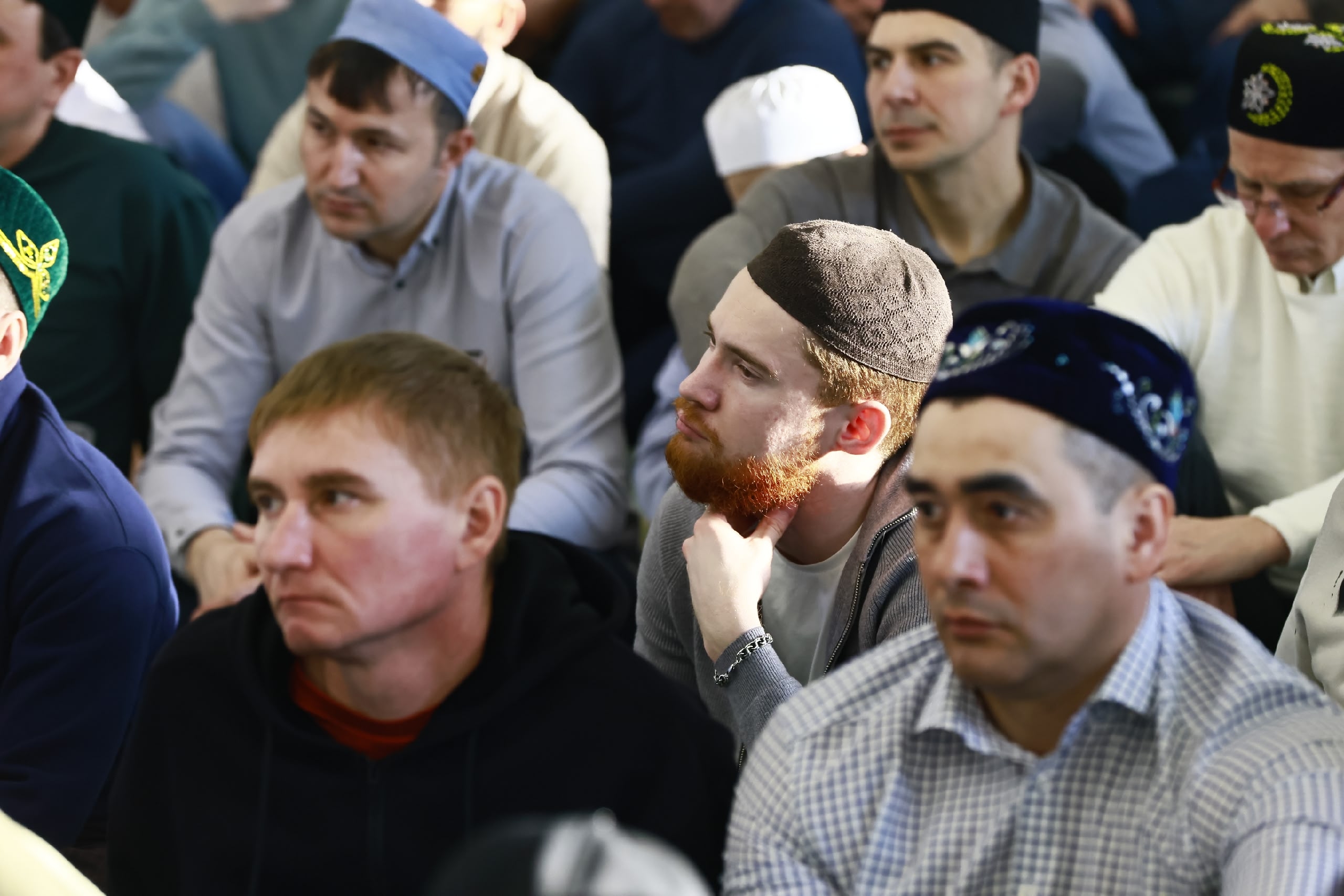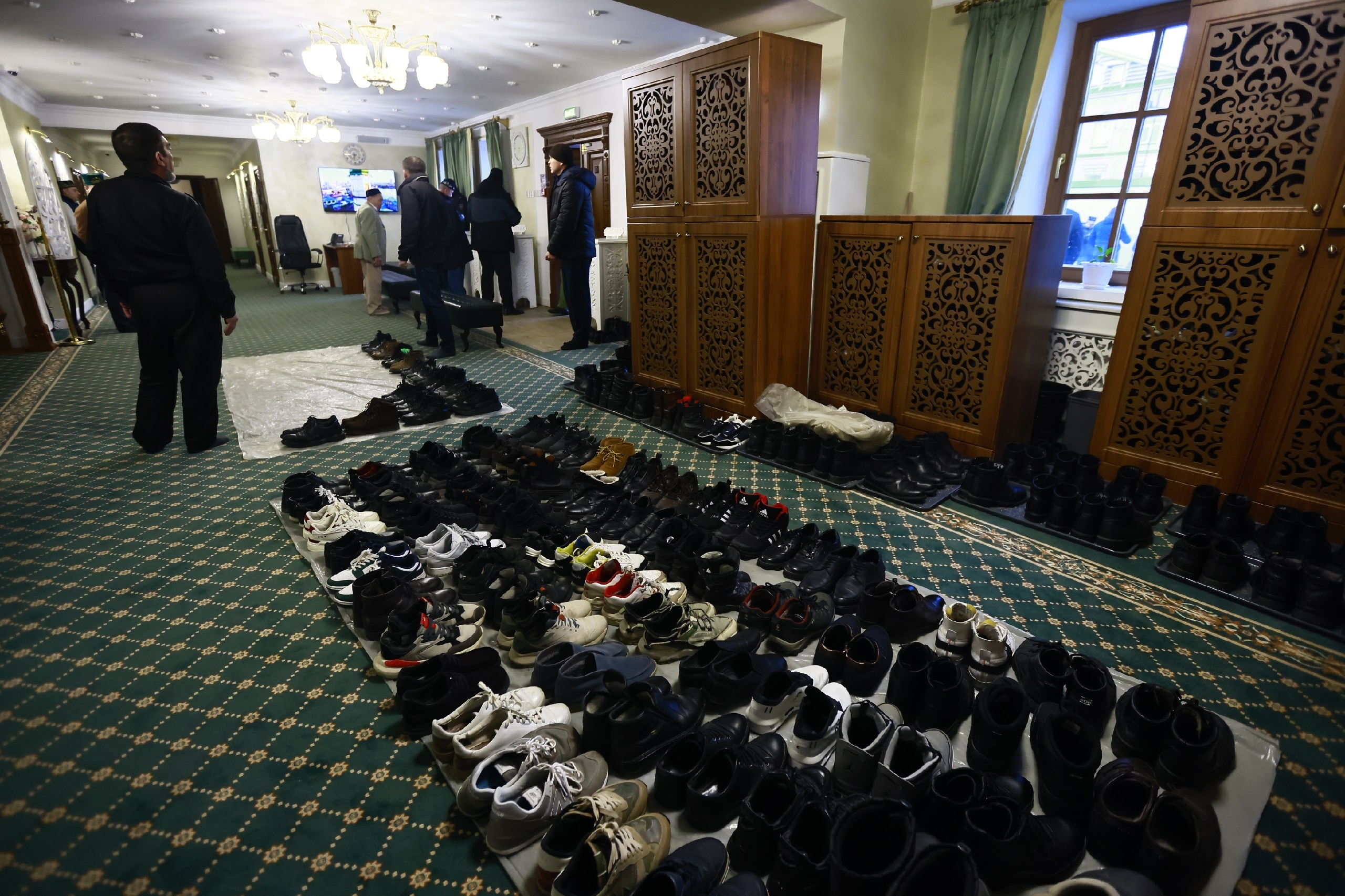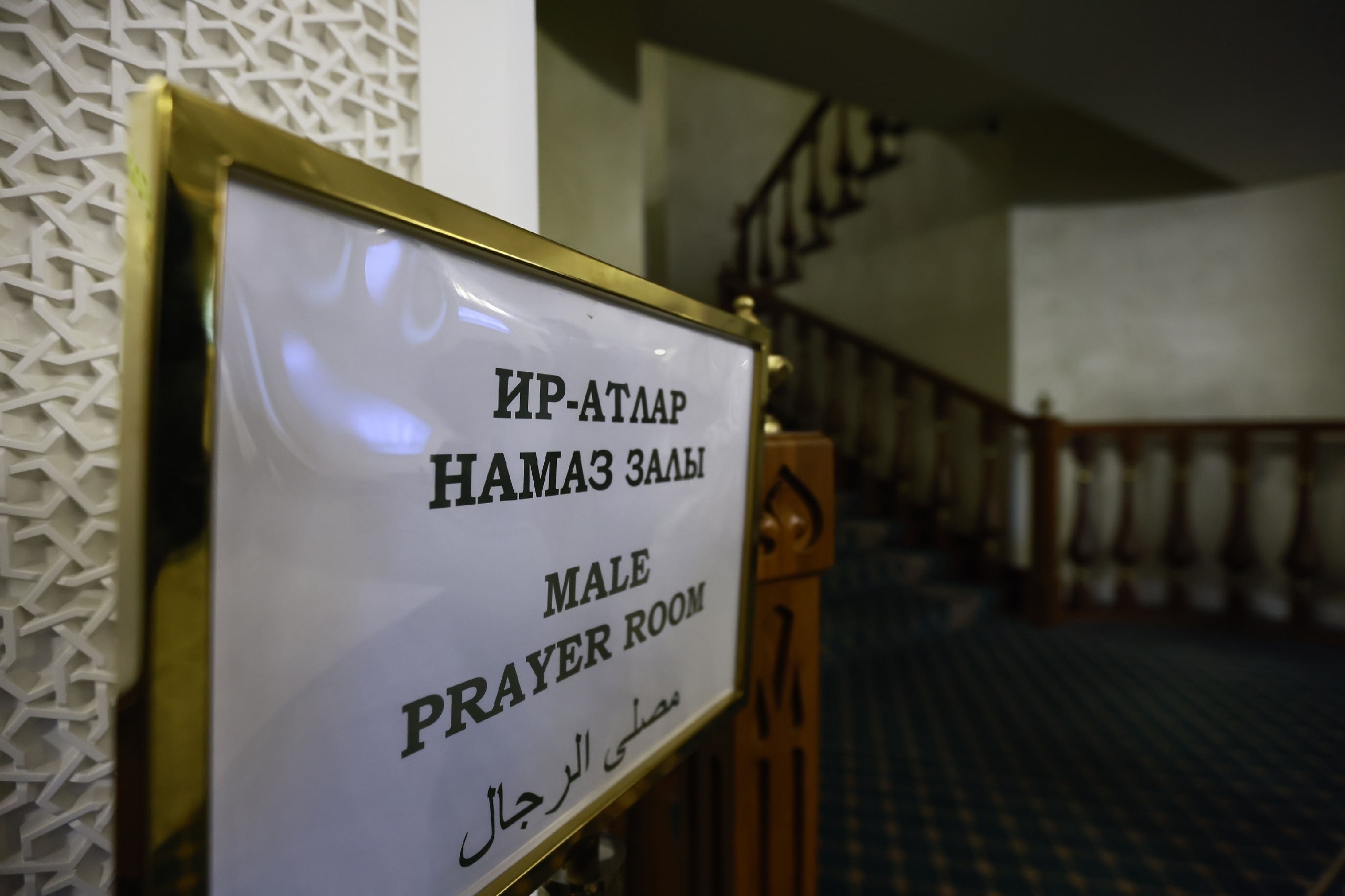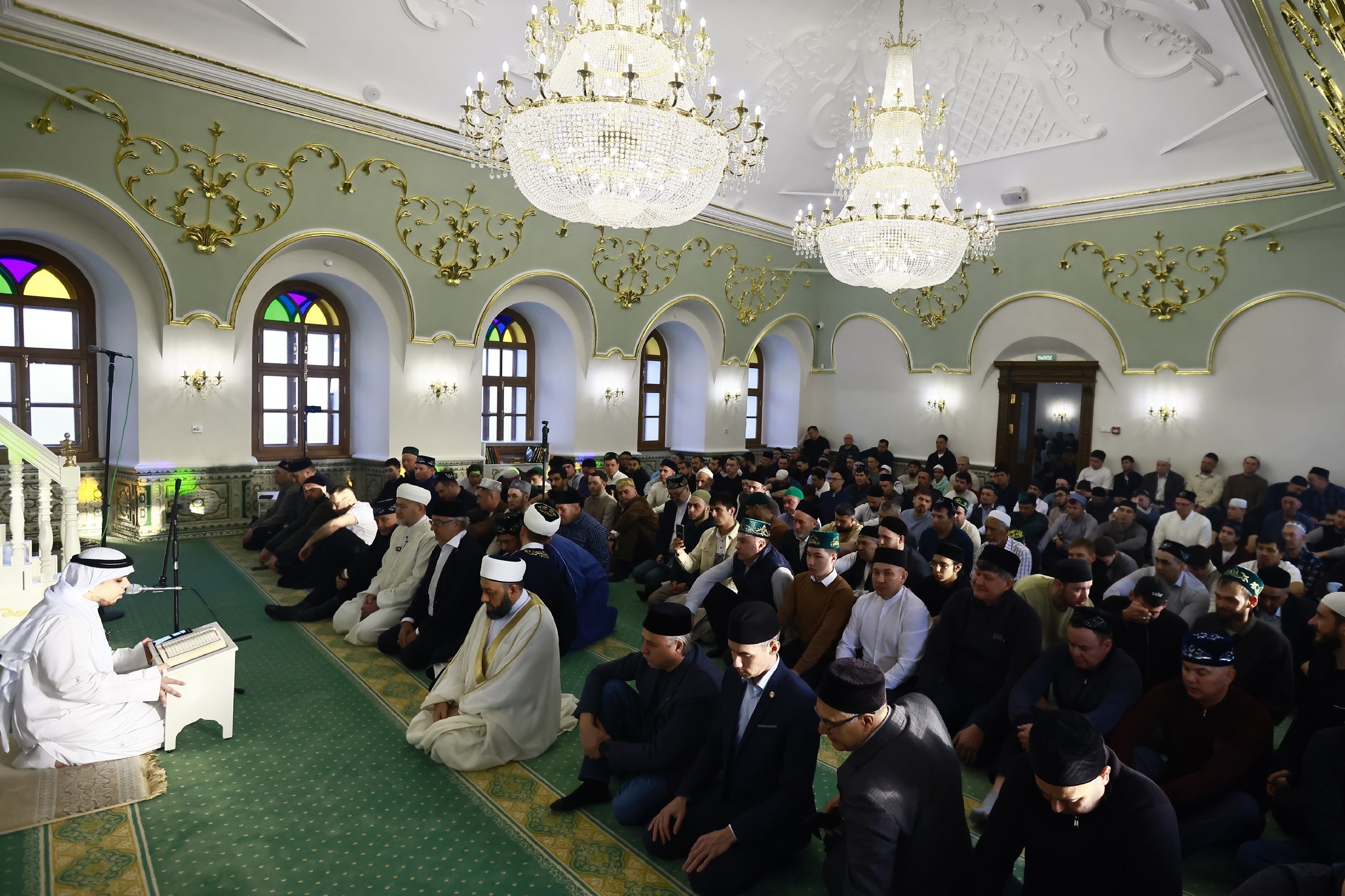 Поднимаемся на второй этаж — когда подходит время прочтения аятов, он уже уже полностью забит. Люди сидят и вне залов — ближе к лестнице. Впрочем, нет места и на первом этаже.