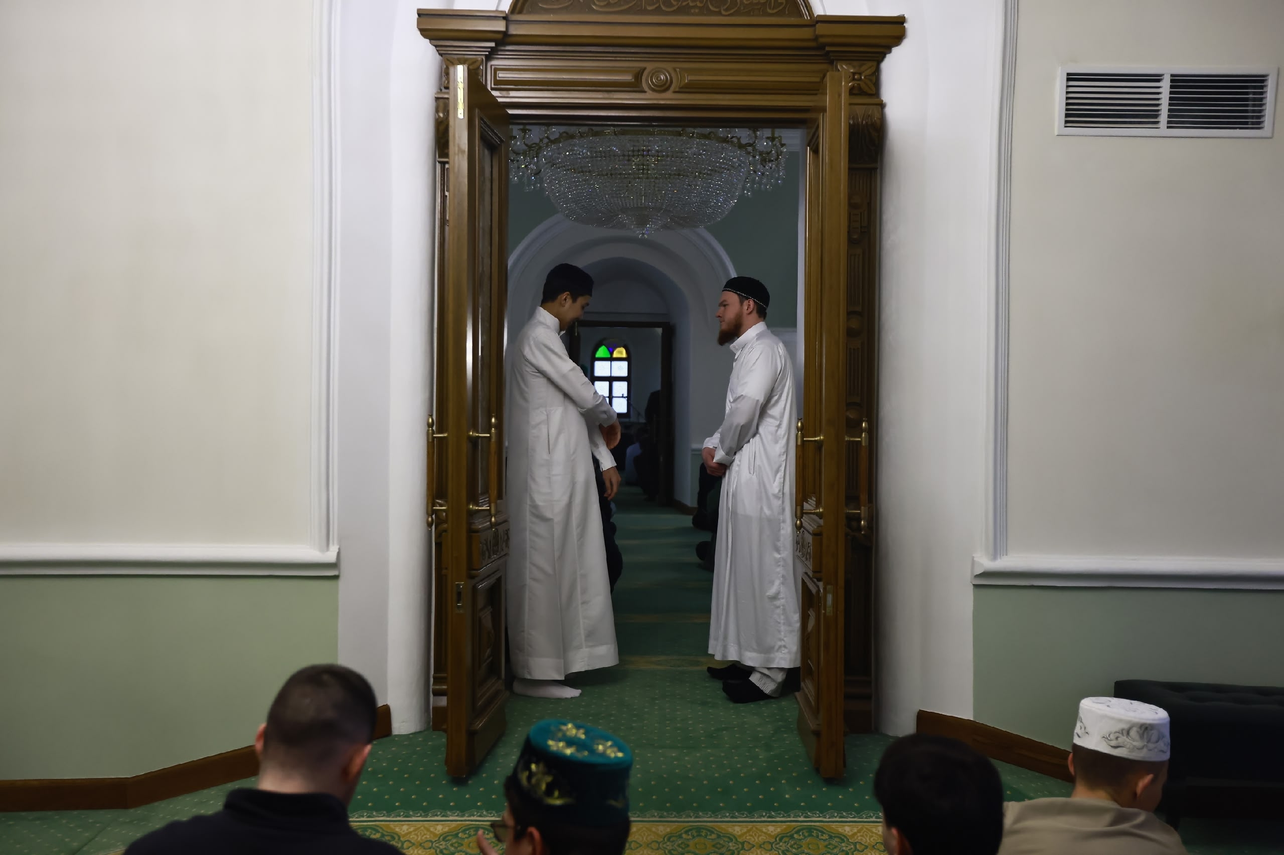 Равно в 6:30 чтец начинает напевать аяты, а мы рассматриваем гостей. Среди них оказались и председатель национального собрания Всемирного конгресса татар «Милли Шура» Василь Шайхразиев, писатель Рабит Батулла, десятки курсантов Казанского танкового училища… Больше никого разглядеть не удалось — девушек попросили уйти во время намаза. Дело в том, что для женщин в исламе предусмотрены отдельные залы, где можно совершать намаз. Например, они есть в Апанаевской мечети.