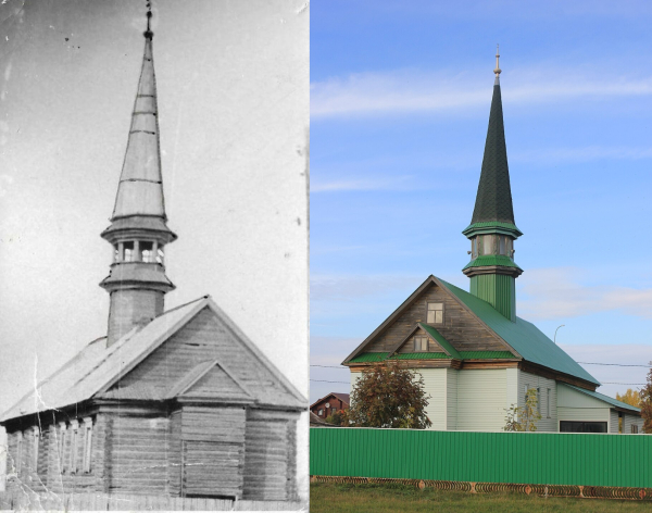 Деревянная мечеть стоит на живописном берегу озера. Это яркий образец традиционного мусульманского зодчества: одноэтажный сруб с высоким подклетом и двухъярусный восьмигранный минарет, увенчанный шатром с полумесяцем.