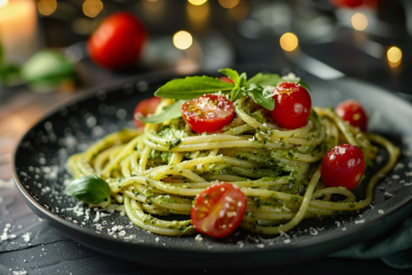 В основе романтического ужина — идеальное песто: взбейте 2 авокадо, пучок базилика, 50 г кедровых орехов, 2 зубчика чеснока, сок 1 лимона и 4 ст. л. оливкового масла. Отварите 200 г спагетти аль денте, смешайте с соусом. Добавьте вишневые томаты и щепотку чёрного перца. Калорийность порции — 450 ккал. Подавайте на тарелках с салатом из руколы. Аромат разнесется по всему дому, создавая уют.