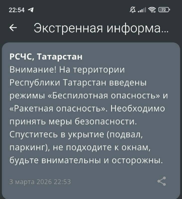 В Татарстане объявили режим беспилотной и ракетной опасности. Соответствующее сообщение появилось в официальном приложении МЧС России.
